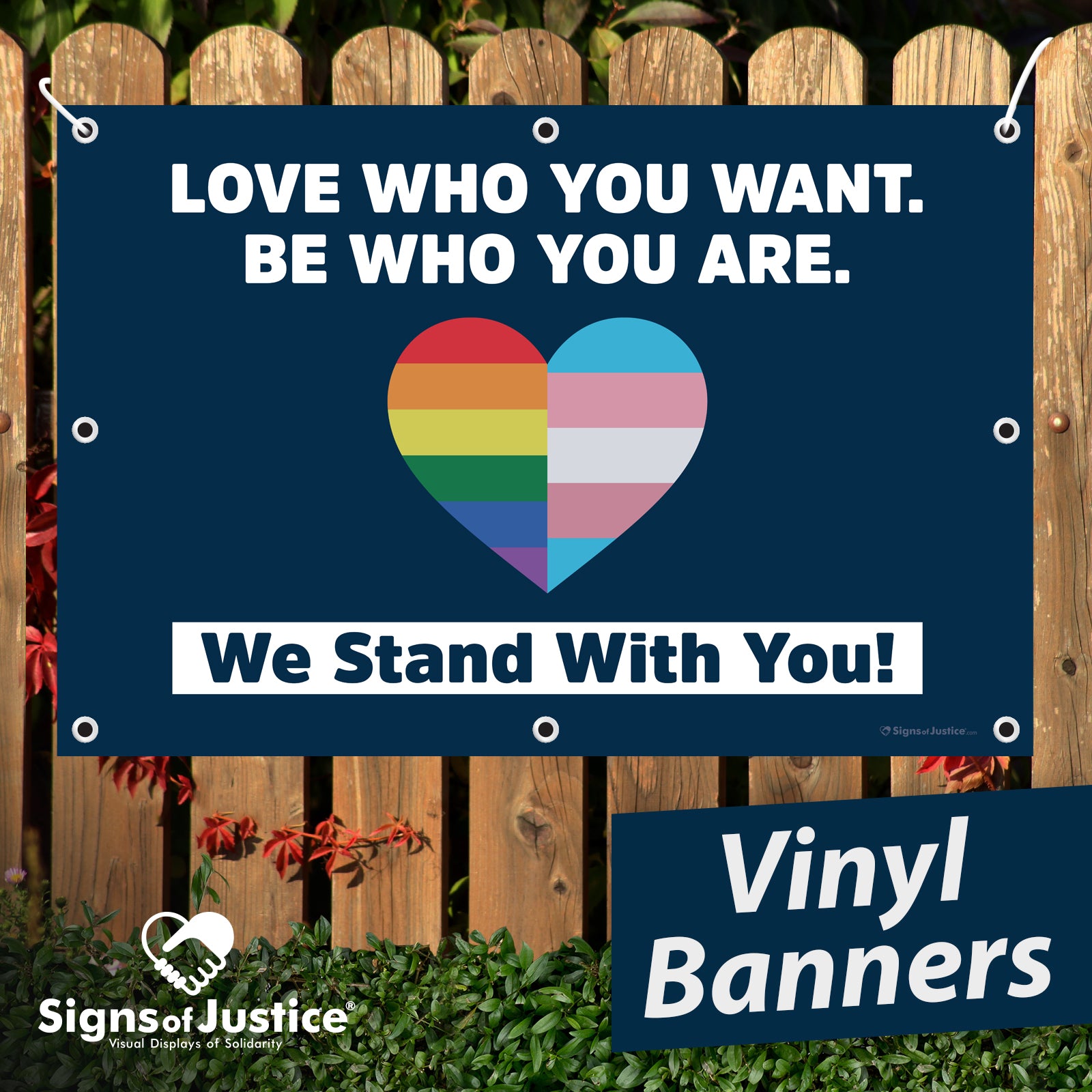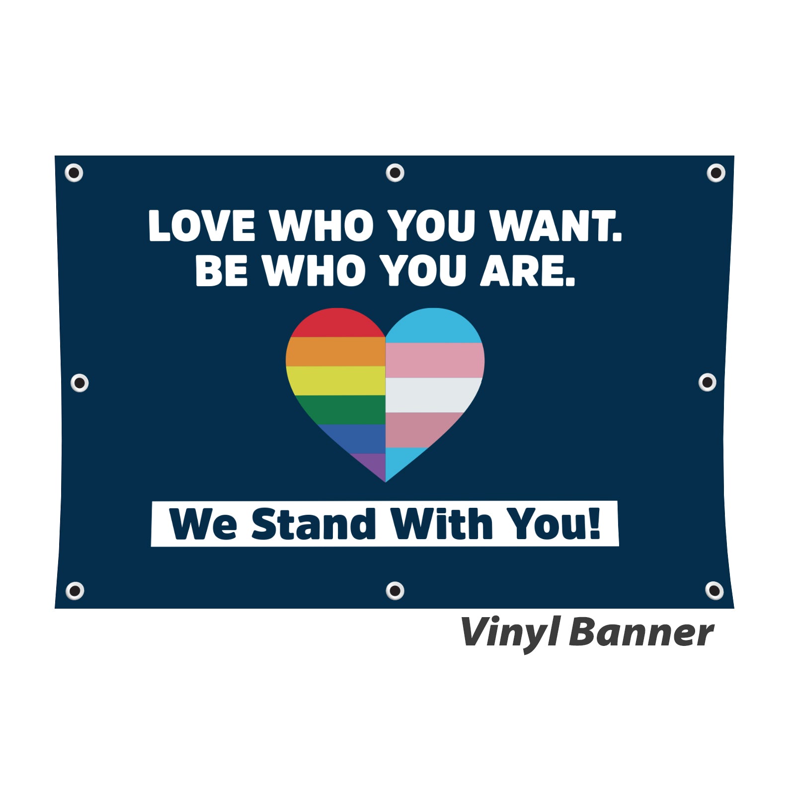 Display your message with pride with our high-resolution, full-color Love Who You Want. Be Who You Are Vinyl Banner. Each banner is printed on premium weather-resistant vinyl and is hemmed and grommeted for easy display.