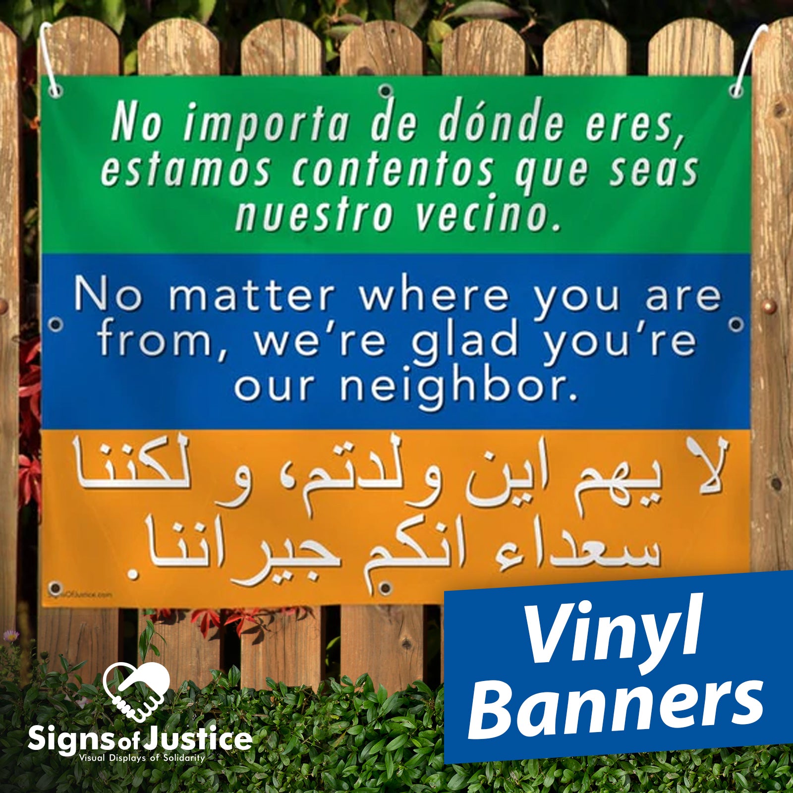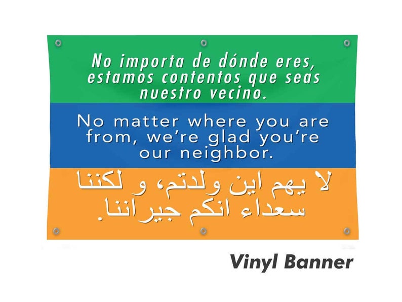 Our original Welcome Your Neighbors Vinyl Banner captures the spirit of the resistanCE through its simple and impactful message. The Welcome Your Neighbors Vinyl Banner stands for fairness and justice by reading in English, Spanish, & Arabic: